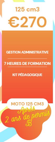 Il s’agit d’une formation de 7h, à la conduite d’un deux-roues 125 cm³, ouverte à tous les titulaires du permis B depuis plus de 2 ans.