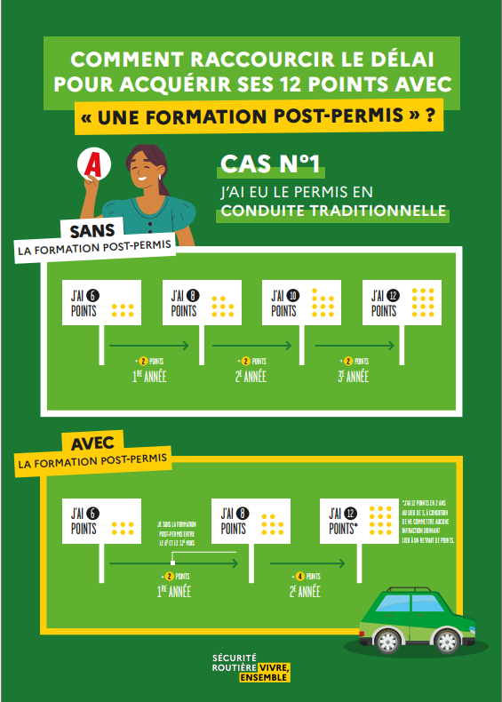 En suivant la formation, la période probatoire est réduite à 2 ans au lieu de 3 ans pour les formations traditionnelles et a 1 an et demi au lieu de 2 ans pour ceux qui ont bénéficié de la conduite accompagnée.